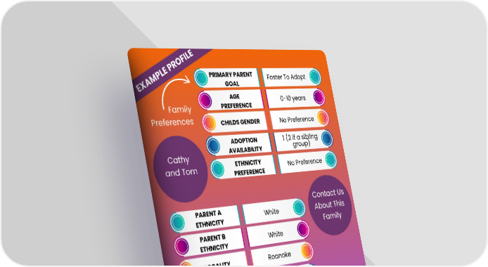 E L I F O R P E L PRIMARY PARENT P Foster To Adopt M A GOAL X E AGE 0-10 years PREFERENCE Family Preferences CHILDS GENDER No Preference ADOPTION 1 (2 if a sibling group) AVAILABILITY Cathy ETHNICITY No Preference and Tom PREFERENCE Contact Us PARENT A White About This ETHNICITY Family PARENT B White ETHNICITY Roanoke LOCALITY Yes MARRIED Family Female 12 Years BIO CHILDREN Male 7 Years IN HOME Demographics SPIRITUAL yes FAMILY LGBTQ+ Yes FRIENDLY PETS Yes, 2 dogs OTHER N/A INFO