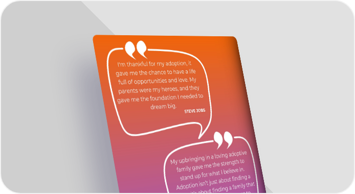 I'm thankful for my adoption, it gave me the chance to have a life full of opportunities and love. My parents were my heroes, and they gave me the foundation I needed to dream big. STEVE JOBS My upbringing in a loving adoptive family gave me the strength to stand up for what I believe in. Adoption isn’t just about finding a home, it’s about finding a family that nurtures who you are meant to become. COLIN KAEPERNICK FLIP BOOK NAVIGATION 1 - Use the to scroll the whole flipbook and meet all our families. 2 - Use the in the top right to access our navigation by families and placement age preferences.