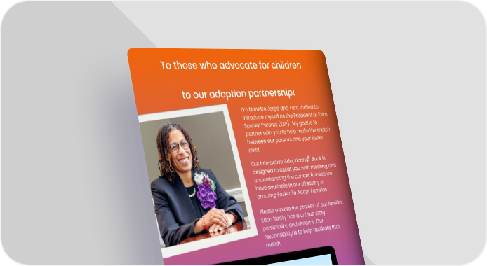 To those who advocate for children to our adoption partnership! I’m Nanette Jorge and I am thrilled to introduce myself as the President of Extra Special Parents (ESP). My goal is to partner with you to help make the match between our parents and your foster child. Out interactive AdoptionFlip Book is designed to assist you with meeting and understanding the current familes we have available in our directory of amazing Foster To Adopt Families Please explore the profiles of our familes. Each family has a unique story, personality, and dreams. Our responsibility is to help facilitate that match