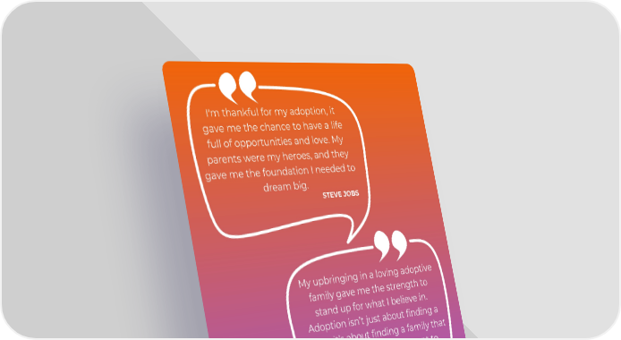 I'm thankful for my adoption, it gave me the chance to have a life full of opportunities and love. My parents were my heroes, and they gave me the foundation I needed to dream big. STEVE JOBS My upbringing in a loving adoptive family gave me the strength to stand up for what I believe in. Adoption isn9t just about finding a home, it9s about finding a family that nurtures who you are meant to become. COLIN KAEPERNICK FLIP BOOK NAVIGATION 1 - Use the to scroll the whole flipbook and meet all our families. 2 - Use the in the top right to access our navigation by families and placement age preferences.