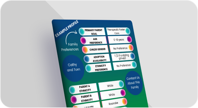 E L I F O R P E Therapeutic Foster L PRIMARY PARENT P M Care A GOAL X E AGE 0-10 years PREFERENCE Family Preferences CHILDS GENDER No Preference ADOPTION 1 (2 if a sibling group) AVAILABILITY Cathy ETHNICITY No Preference and Tom PREFERENCE Contact Us PARENT A White About This ETHNICITY Family PARENT B White ETHNICITY Roanoke LOCALITY Yes MARRIED Family Female 12 Years BIO CHILDREN Male 7 Years IN HOME Demographics SPIRITUAL yes FAMILY LGBTQ+ Yes FRIENDLY PETS Yes, 2 dogs OTHER N/A INFO