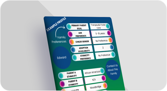 E L I F O R P E Therapeutic Foster L PRIMARY PARENT P M Care A GOAL X E AGE 5 -15 years PREFERENCE Family Preferences CHILDS GENDER No Preference ADOPTION 2 AVAILABILITY ETHNICITY Edward No Preference PREFERENCE Contact Us PARENT A African American About This ETHNICITY Family PARENT B N/A ETHNICITY Woodbridge LOCALITY No MARRIED Family 4 Adopted BIO CHILDREN Children IN HOME Demographics SPIRITUAL Yes FAMILY LGBTQ+ Yes FRIENDLY PETS No OTHER N/A INFO